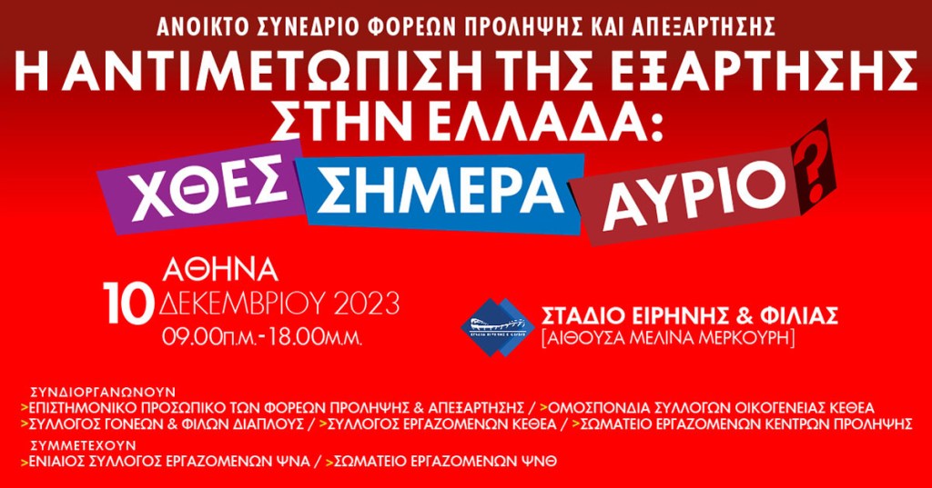Επιστήμονες και συλλογικότητες από όλο το φάσμα του πεδίου πρόληψης και θεραπευτικής αντιμετώπισης των εξαρτήσεων στη χώρα μας, προσκαλούν στο ανοικτό συνέδριο «H αντιμετώπιση της εξάρτησης στην Ελλάδα: Χθες, σήμερα, αύριο» την Κυριακή 10 Δεκεμβρίου 2023, 09:00-18:00, στο Στάδιο Ειρήνης και Φιλίας, αίθουσα Μελίνα Μερκούρη. Το συνέδριο επιχειρεί να ανοίξει έναν ευρύ επιστημονικό, πολιτικό και… Διαβάστε περισσότερα: ΑΝΟΙΧΤΟ ΣΥΝΕΔΡΙΟ ΦΟΡΕΩΝ ΠΡΟΛΗΨΗΣ ΚΑΙ ΑΠΕΞΑΡΤΗΣΗΣ 10/12/23 - ΣΩΣΤΕ ΤΗΝ ΑΠΕΞΑΡΤΗΣΗ!
