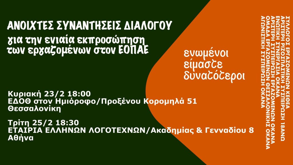 Ο Σύλλογος Εργαζομένων στο ΚΕΘΕΑ, μαζί με την Αριστερή Ριζοσπαστική Συσπείρωση 18 ΑΝΩ, την Ενωτική Συνεργασία ΟΚΑΝΑ, την Αριστερή Συσπείρωση Εργαζομένων ΟΚΑΝΑ, την Αγωνιστική Συσπείρωση ΟΚΑΝΑ και Ομάδα Εργαζομένων Θεσσαλονίκης ΟΚΑΝΑ, παίρνουμε την πρωτοβουλία να συζητήσουμε οργανωμένα, ως εργαζόμενες και εργαζόμενοι σε έναν νεοσύστατο Οργανισμό, στην κατεύθυνση της δημιουργίας ενός ενιαίου συλλόγου εργαζομένων στον ΕΟΠΑΕ…. Διαβάστε περισσότερα: ΚΑΛΕΣΜΑ ΣΕ ΑΝΟΙΧΤΕΣ ΣΥΝΑΝΤΗΣΕΙΣ ΔΙΑΛΟΓΟΥ ΤΩΝ ΕΡΓΑΖΟΜΕΝΩΝ ΣΤΟΝ ΕΟΠΑΕ - 1114: ΑΝΑΜΕΙΝΑΤΕ ΣΤΟ ΑΚΟΥΣΤΙΚΟ ΣΑΣ…